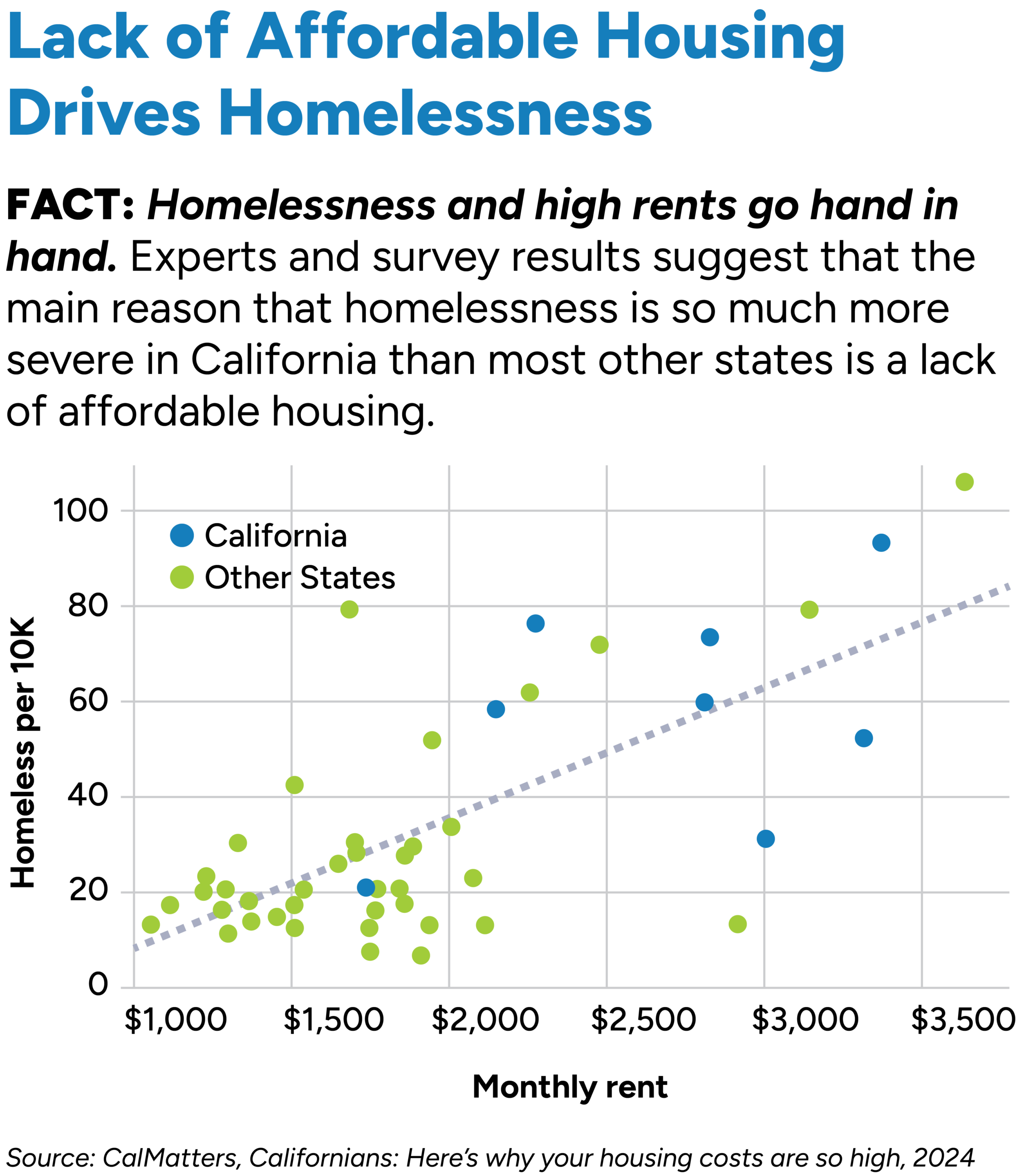 High rents and expensive homes are driving families and high-wage jobs out of California. Expensive housing is the main driver of homelessness, and too many Californians are just one financial emergency away from not being able to pay the rent and ending up on the street.