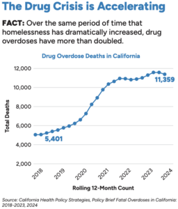 • Drug overdose deaths in California have more than doubled, and homelessness has increased by about 45% since 2018.
