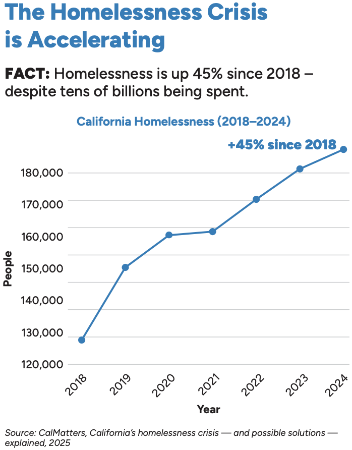 • Since 2014, California has seen a sharp rise in homelessness, even as most other states have seen reductions. Today, more than 180,000 Californians are homeless, and nearly half struggle with substance abuse.