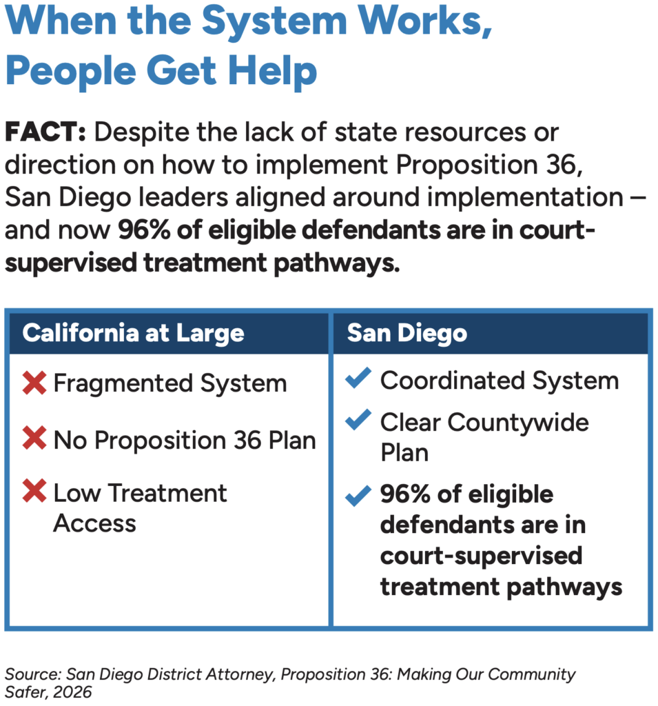 San Diego County has already shown that effective Proposition 36 implementation is possible. Despite limited state funding, local leaders aligned courts, law enforcement, and behavioral health providers around a shared goal: getting people into treatment. According to the San Diego District Attorney, over 96% of eligible defendants are now routed into treatment pathways through court-supervised programs — instead of cycling on and off the streets without intervention.